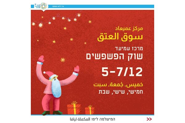 שוק כריסמס חוזר ליפו בסוף השבוע הקרוב עם פעילויות חינמיות לכל המשפחה האירוע יתקיים בשוק הפשפשים ובמרכז עמיעד ביפו ויכלול פעילויות, סדנאות והפעלות מגוונות לכל המשפחה, והכול ללא תשלום. 5-7/12