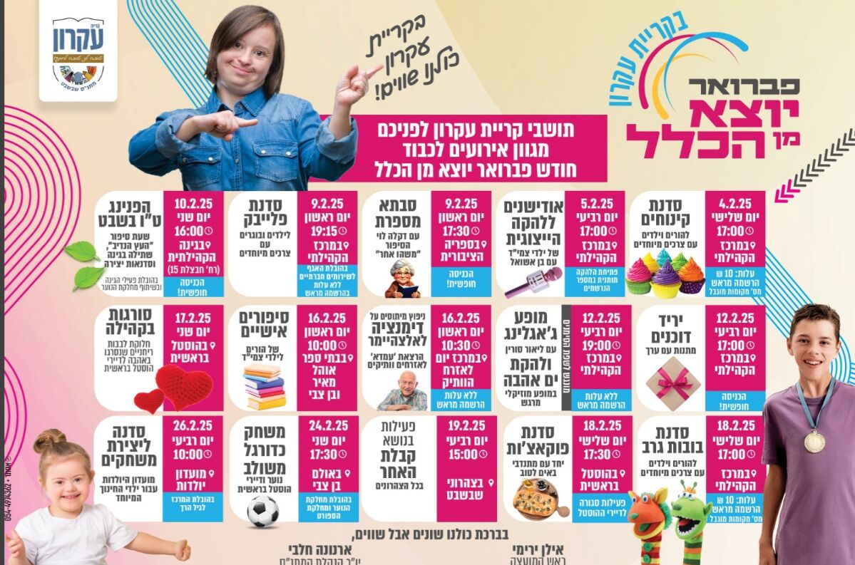 במהלך חודש פברואר יתקיימו בקריית עקרון אירועי פברואר יוצא מן הכלל - חודש פעילויות לעידוד השתלבות, נגישות, היכרות ושותפות של ילדים ואנשים עם מוגבלות