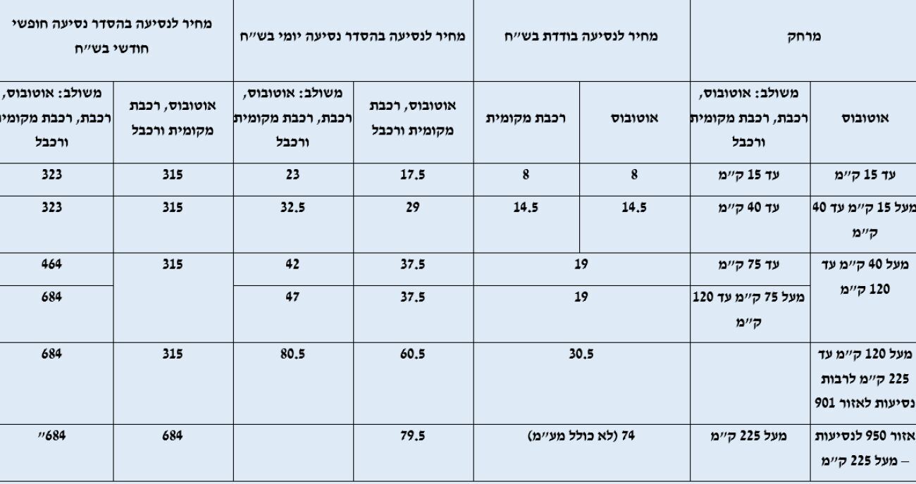 חופשי יומי 29-79.5 ש"ח באוטובוס ומשולב רכבת 32.5 ועד 80.5 ש"ח