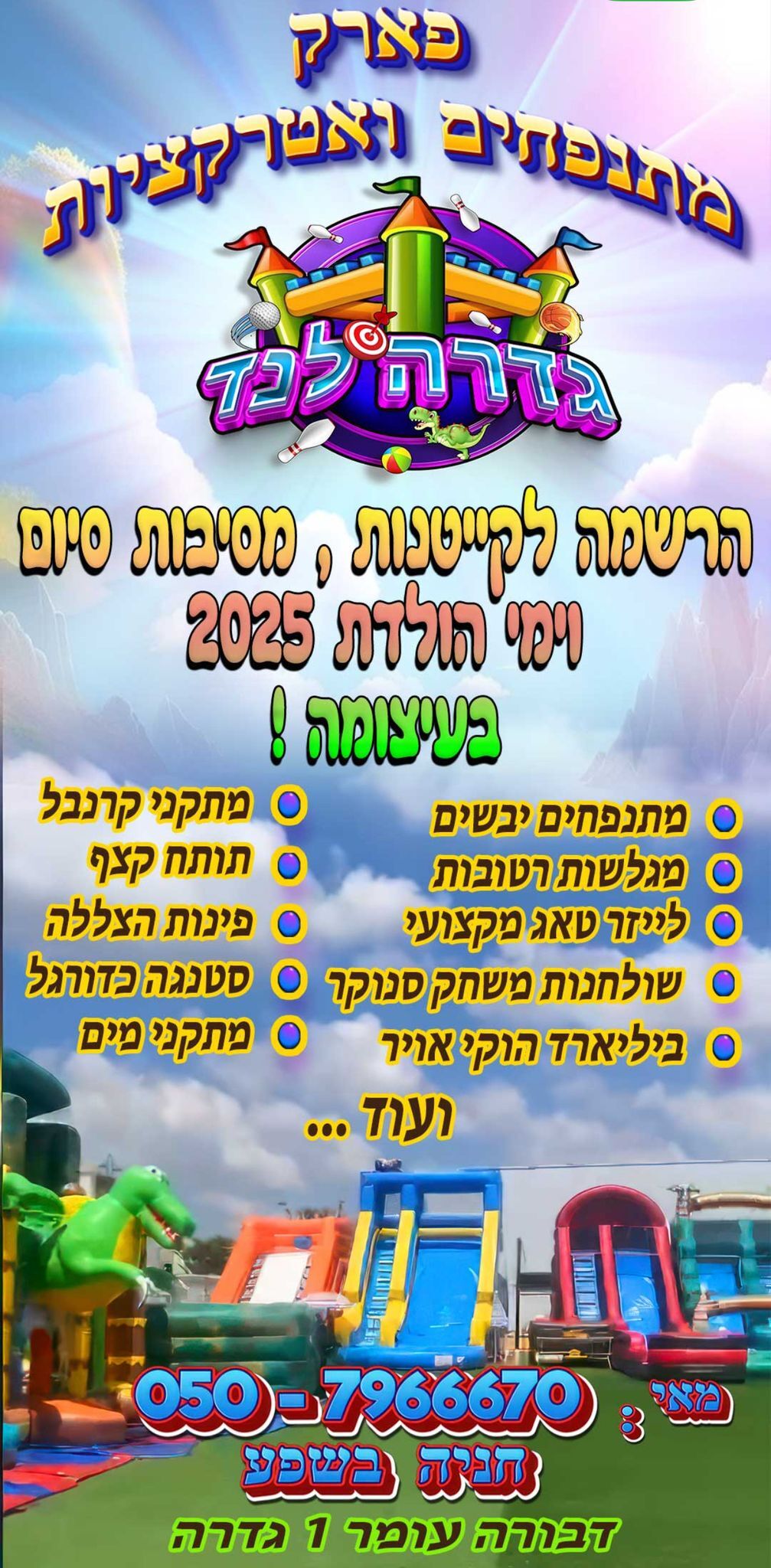 גדרהלנד, פארק המתנפחים היבש והרטוב , מציע חוויות ריגוש והנאה לכל הגילאים. הפארק מספק פעילות משפחתית איכותית ומקום כיף לבילוי בטוח – לילדים, לנוער ולמשפחות.