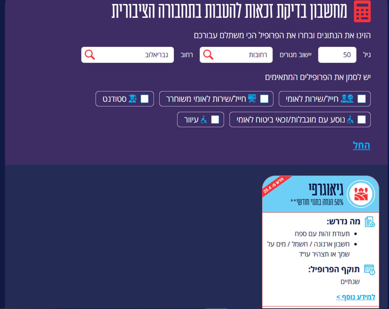 היכנסו לאתר משרד התחבורה והקליקו על באנר "צדק תחבורתי", שם תמצאו מחשבון בדיקת זכאות להטבות בתחבורה הציבורית. הזינו גיל, יישוב ורחוב (בחלק מהרחובות בעיקר הגדולים, תצטרכו להזין את מספר הבית). אם אתם זכאים להנחה על בסיס סוציו-אקונומי או פריפריאלי, ייפתח חלון "פרופיל גיאוגרפי". המשיכו לעדכון הפרופיל בהתאם להנחיות.