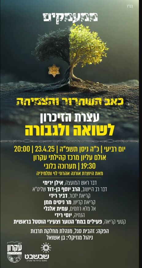 ביום רביעי 23.4 תתקיים בקריית עקרון העצרת המרכזית ליום הזיכרון לשואה בסימן "ממעמקים כאב השחרור והצמיחה"