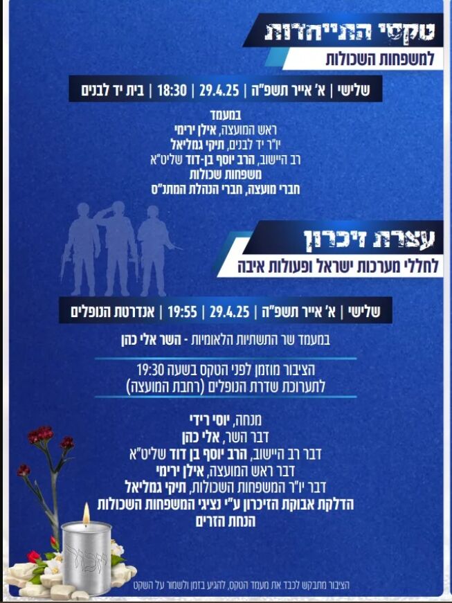 בשעה 18:30 יתקיים טקס התייחדות למשפחות השכולות בבית יד לבנים