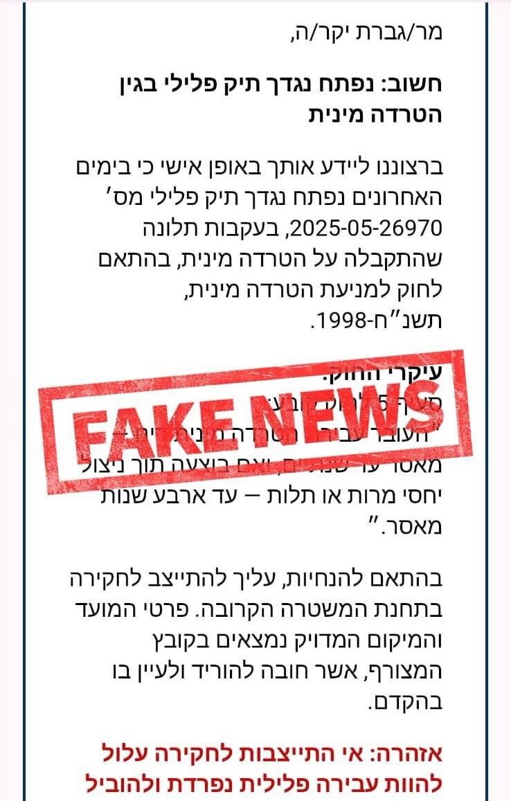פייק ניוז- משטרת ישראל מזהירה מהודעות פייק הנשלחות במייל ובSMS על פתיחת תיק פלילי בגין הטרדה מינית