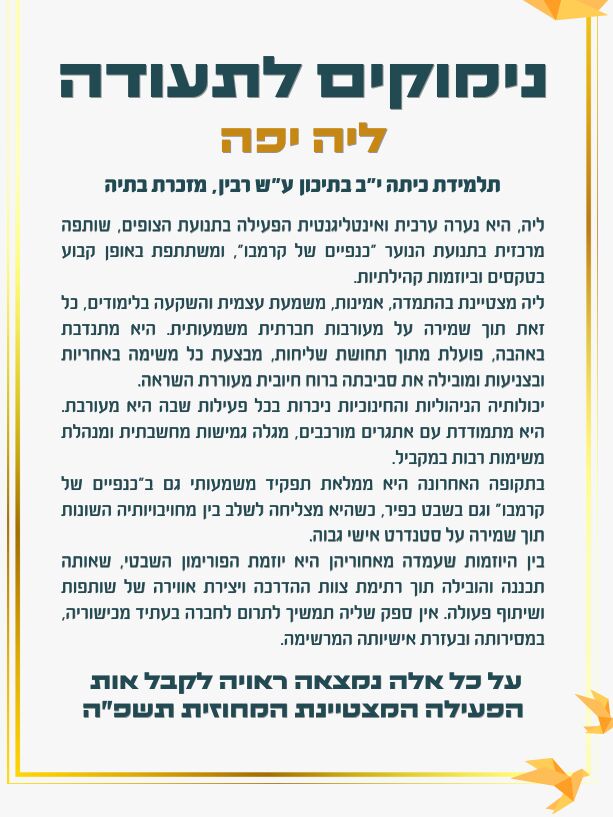 ליה נבחרה על כך שבלטה באופן מיוחד בפעילות חברתית למען הקהילה. המון נחת להורים עדי ושי שהם בעצמם סמל לנתינה והתנדבות קהילתית מרשימה.