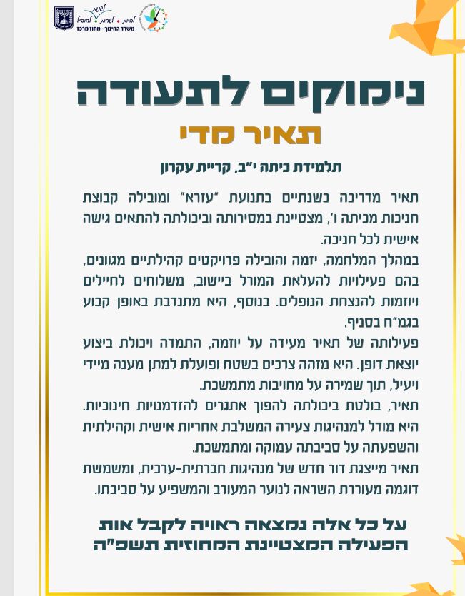 תאיר מדי מקריית עקרון קבלה את אות הפעיל המצטיין המחוזי