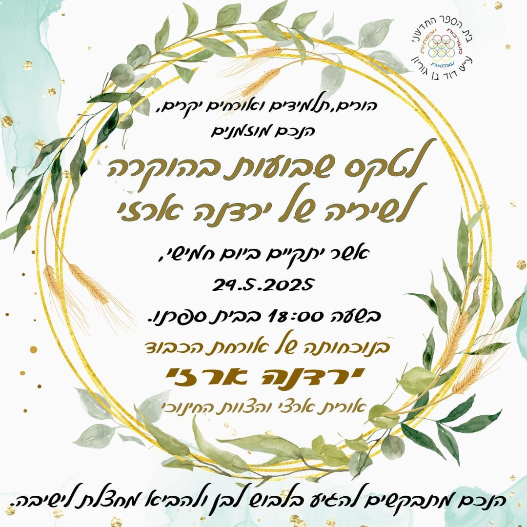 ביום חמישי 29.5.25 באירוע סגור לתלמידים וההורים עתיד להתקיים ערב ההוקרה עם מיטב שיריה של הזמרת האהובה שעתידה להיות אורחת הכבוד
