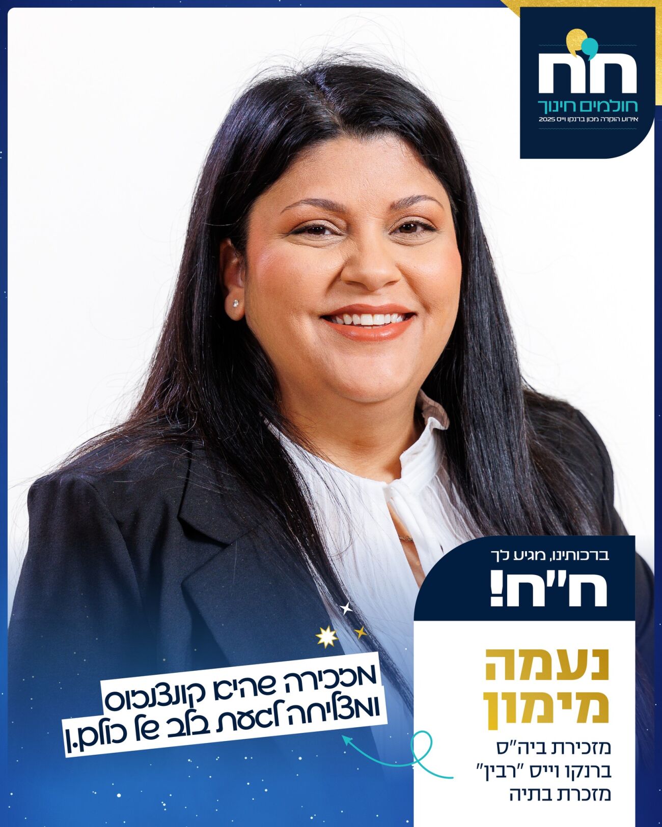 מזכרת בתיה: מנהל ביה"ס קשת ידידיה עציון ומזכירת תיכון רבין, נעמה מימון נבחרו למצטייני רשת ברנקו וייס