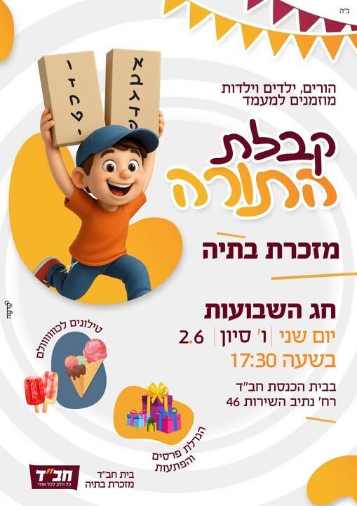 חגיגה במזכרת בתיה: בית חב"ד מזמין ילדים ומשפחות לשמיעת עשרת הדיברות, גלידות, הגרלת פרסים והצגה ערכית ביום שני 2/6