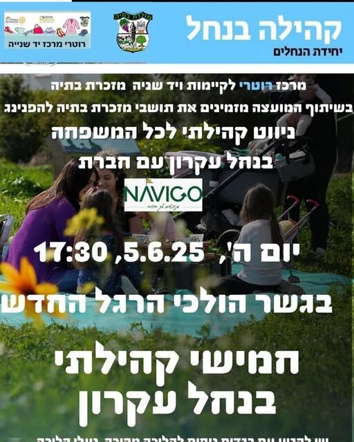 ביום חמישי 5/6 במזכרת בתיה: אירוע ניווט חווייתי ומרתק לכל המשפחה בנחל עקרון, בהובלת מועדון רוטרי ו-NAVIGO - ההשתתפות חופשית ומותנית בהרשמה מראש
