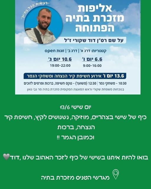 ביום שישי הקרוב ייחנך במגרשי הטניס במזכרת בתיה טורניר טניס ראשון לזכרו של רס"ן דוד שקורי ז"ל, גיבור ישראל. רס"ן שקורי ז"ל אהב את ספורט הטניס, ומשפחתו בחרה להנציחו באמצעות קיום טורניר זה.