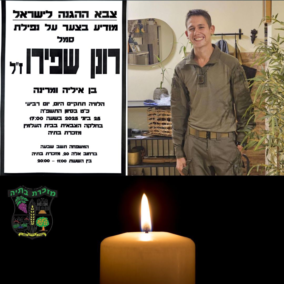 קהילת מזכרת בתיה מרכינה ראש ומשתתפת בצערה הכבד של משפחת שפירו היקרה, על נפילתו של בנם רונן ז"ל, לוחם בהנדסה קרבית, גיבור ישראל שנהרג במהלך פעילות מבצעית בחאן יונס.