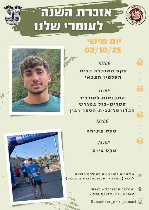 טורניר כדורסל לזכרו של סמל עומרי תמרי ז"ל יתקיים ביום שישי, 3 באוקטובר. הטורניר הוא בסגנון סטריט-בול ומיועד לתלמידי כיתות י' ומעלה.