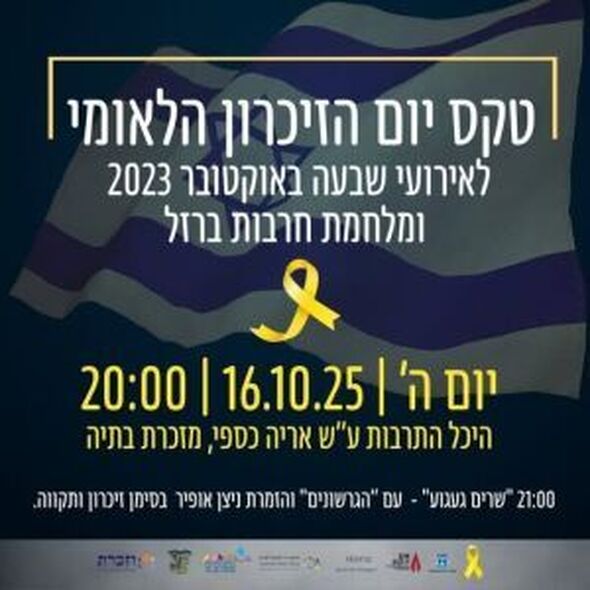 יום הזיכרון הלאומי לאירועי השבעה באוקטובר 2023 ומלחמת חרבות ברזל יצויין היום, ה-16.10.25 בכל רחבי הארץ. המועצה המקומית מזכרת בתיה בשיתוף מרכז קהילתי מפגשים, יקיימו מגוון אירועי זיכרון קהילתיים לציבור הרחב: 20:00 | היכל התרבות ע”ש אריה כספי טקס זיכרון יישובי יחד עם המשפחות השכולות. הטקס ישודר בשידור חי בערוצים הדיגיטליים של המועצה. מיד לאחר הטקס, בשעה 21:00 יתקיים המופע "שרים געגוע" - נשיר עם “הגרשונים" והזמרת ניצן אופיר שירים שכולנו אוהבים בסימן זיכרון ותקווה.