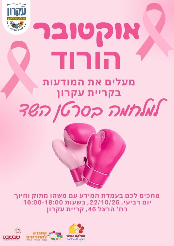 מעלים את המודעות למלחמה בסרטן השד בקריית עקרון: מחר (רביעי 22.10) התושבים מוזמנים להתהלך בלבוש ורוד בנוסף עמדת מידע תוצב ברחוב הרצל