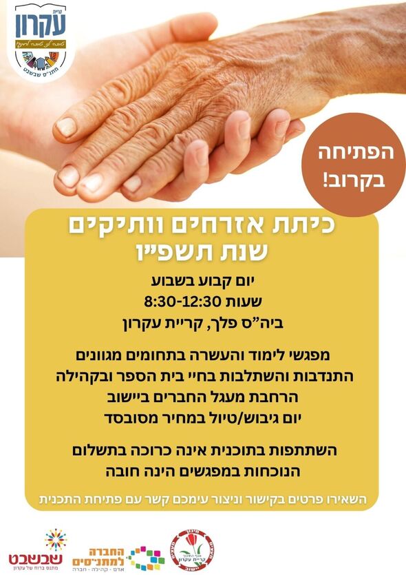 לקראת פתיחת כיתת אזרחים וותיקים לשנת תשפ"ו, מועצת קריית עקרון מזמינה את בני הגיל השלישי להצטרף לפעילות ולהירשם.