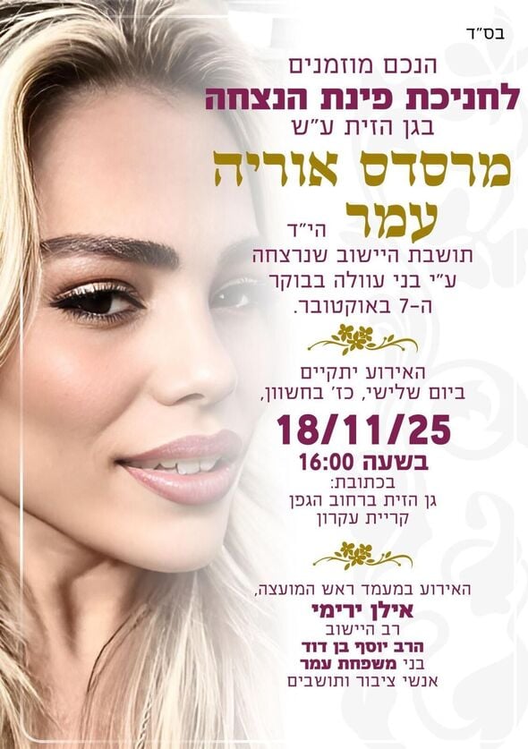 בקריית עקרון תתקיים חנוכת פינת הנצחה לזכרה של מרסדס עמר הי״ד, שנרצחה במתקפת הטרור ב-7 באוקטובר.