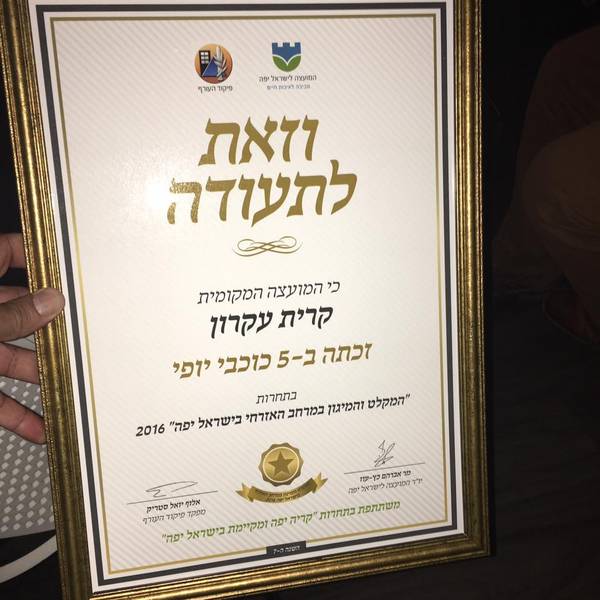 חמישה כוכבי יופי לקרית עקרון בתחרות " רשויות בתחום אחזקת מקלטים ציבוריים בישראל יפה"