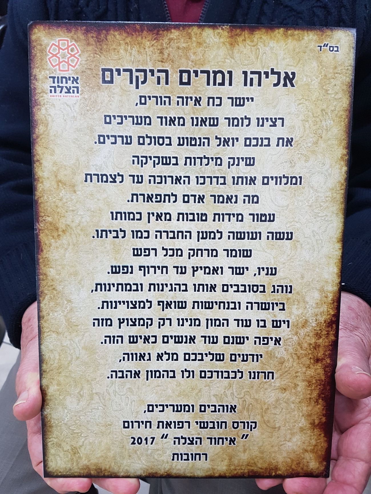 "כל המציל נפש אחת מישראל כאילו קיים עולם מלא, על אחת כמה וכמה אשר ההצלת חיים נעשית ע"פ כללי ההלכה, שתזכו להקים עוד ועוד דורות של חובשים בעיר ובכך תגיעו למצב שיש איש מקצוע בכל רחוב בעיר"