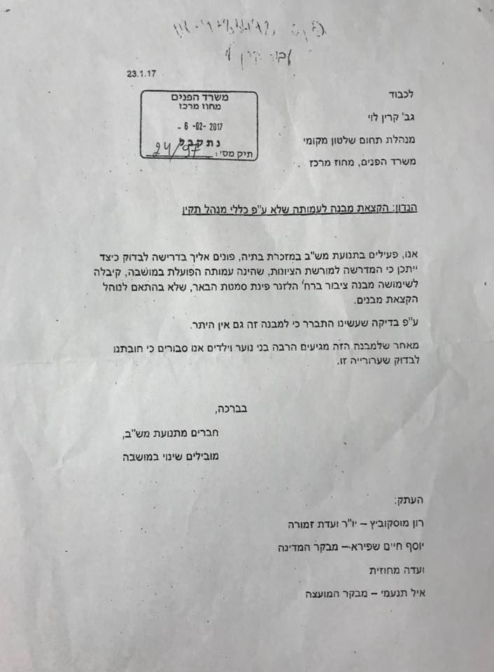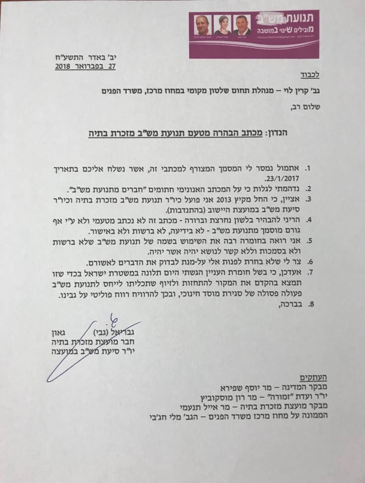 המכתב "המזויף", נשלח למנהלת תחום השלטון המקומי, קרין לוי בינואר 2017. המכתב חתום על ידי חברים מתנועת מש"ב.