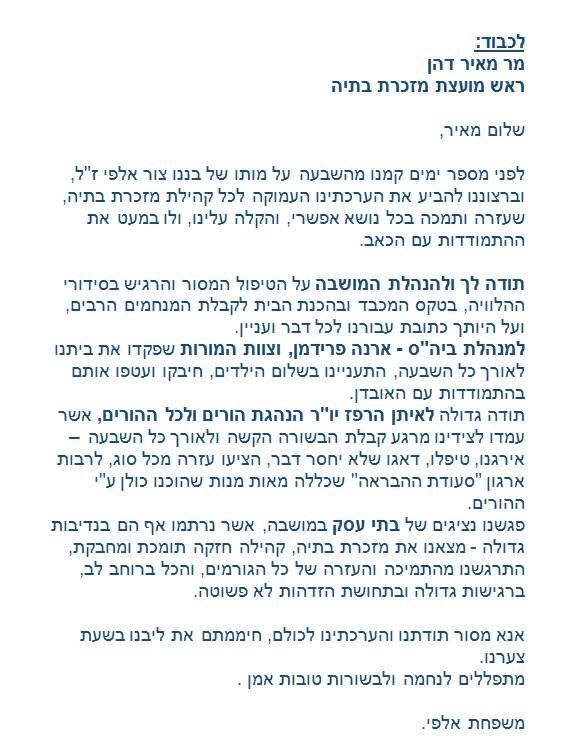 המשפחה שלחה מכתב תודה לראש המועצה שבאמצעותו מבקשת המשפחה להודות לכל קהילת מזכרת בתיה