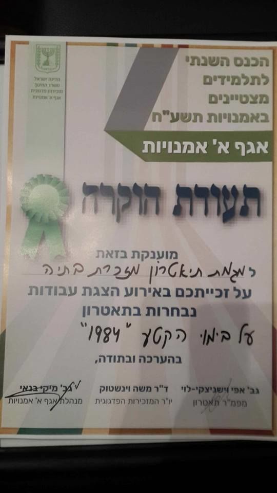 ביום חמישי האחרון ערך משרד החינוך את התחרות הארצית בתחומי האמנויות בתחומים: מחול, תיאטרון, קולנוע ואמנות חזותית. בתחרות השתתפו תלמידים מרחבי הארץ שקבלו פרסים על מוזיקה בתחום הקלאסי ותחום הגאז', כוריאוגרפיה, מחול, משחק תיאטרון והבימוי.