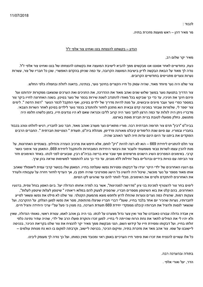 במכתב הבקשה כתבה אימו הדר: