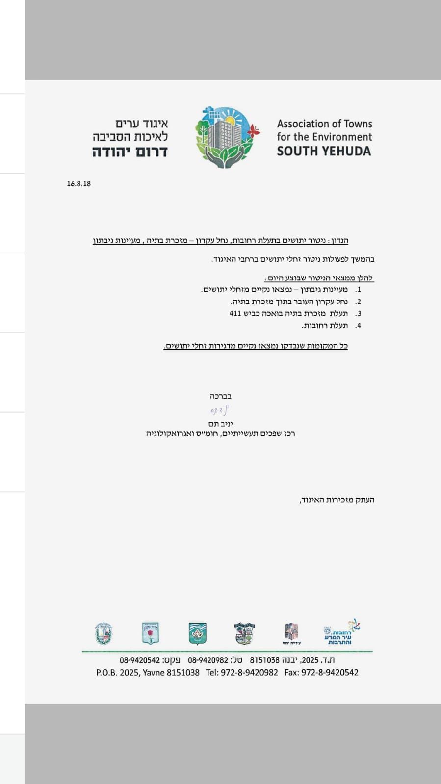 היום 16/8/18 - נערכה בדיקה במזכרת בתיה ובכל המקומות שנבדקו נמצאו נקיים מדגירות זחלי יתושים... להלן האישור