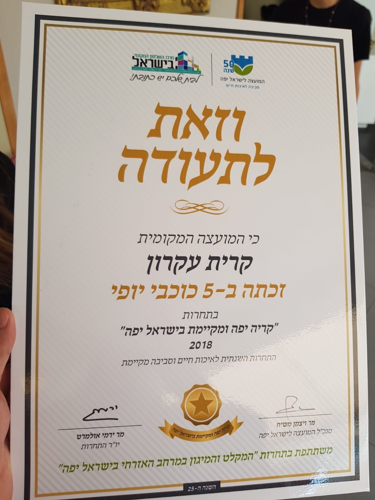 בשבוע שעבר נערך טקס הכרזת הזוכים בתחרות קרייה יפה ומקיימת בארץ ישראל יפה, שנערכת מידי שנה על ידי המועצה לישראל יפה בחסות משרד הפנים והמרכז לשלטון מקומי. בטקס השתתפה גם המועצה המקומית קריית עקרון שזכתה בפעם החמישית ברציפות ב5 כוכבי היופי. היעד המרכזי של התחרות הוא הטמעת ההכרה בחשיבות טיפוח הסביבה לאיכות החיים של התושבים. במסגרת התחרות התקיים סיור ביישוב ע"י ועדת השיפוט של התחרות. חברי הועדה התרשמו מאוד מהתקדמות הפיתוח שנעשתה בגנים הציבורים ,מוסדות החינוך, ניקיון המרחב הציבורי צמחיה ועוד.