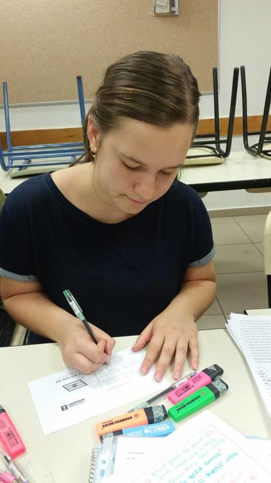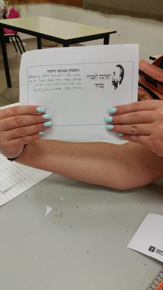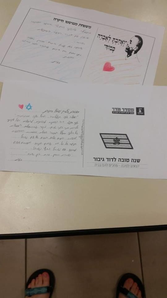 תלמידות ביה"ס פלך בקריית עקרון שלחו גלויות שנה טובה למשפחות הדר גולדין, אורון שאול ואברה מנגיסטו כחלק ממיזם יוצאים לסוכה- "מחכים להם בבית" התומך במשפחות