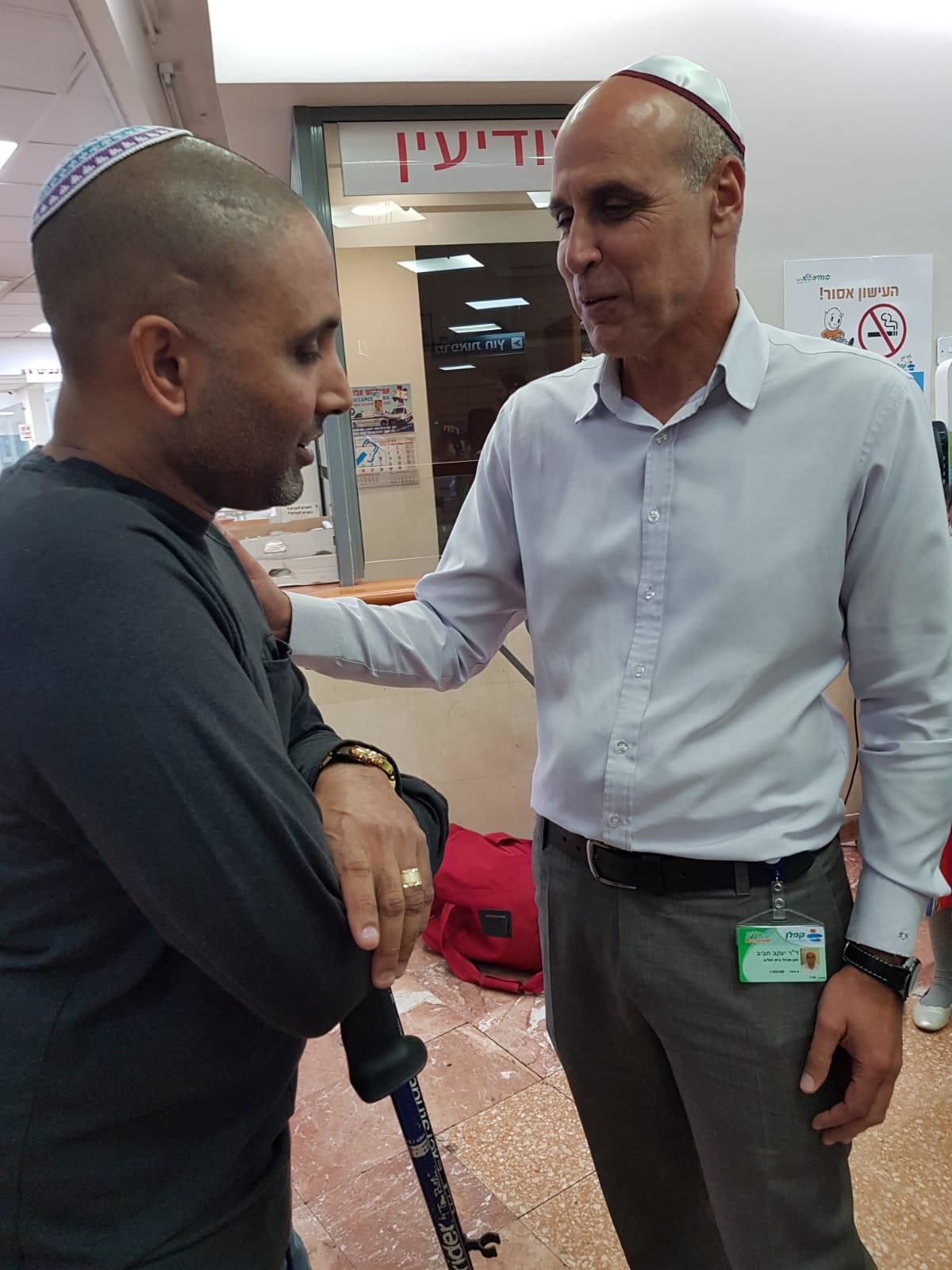 ניב נחמיה תושב קרית עקרון אשר נדקר בפיגוע חבלני ביבנה הגיע לבית חולים קפלן להדליק נרות עם הצוות שהציל את חייו