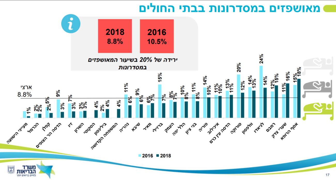 עוד נתון שנחשף הוא שבבית החולים קפלן חלה ירידה במספר המאושפזים ששהו במסדרונות 2% בשנת 2018 לעומת 5% בשנת 2016 .