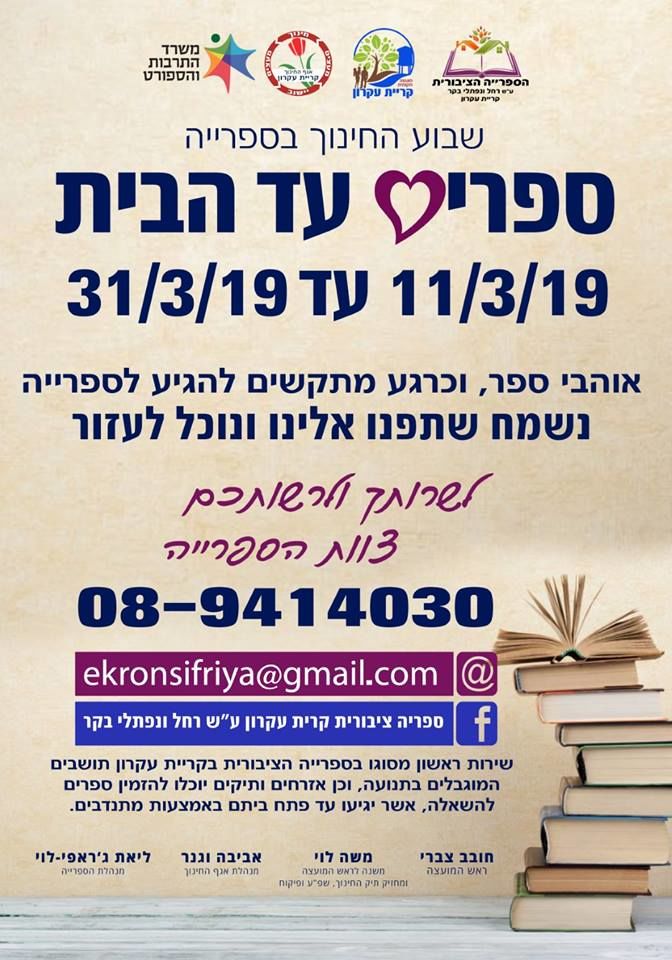 פרויקט ''ספר עד הבית'' יוצא לדרך בקריית עקרון. מועצת קריית עקרון תפעיל באמצעות הספרייה את שירות ''ספרים עד הבית.'' מדובר ביוזמה של הספרייה המקומית וצוות הספרייה ובשיתוף פעולה עם רותי לוי ומחלקת התשתיות שיעזרו לאסוף ולחלק את הספרים בבתים עבור קהילת תושבי המקום ותפעל כפיילוט במסגרת שבוע החינוך. במסגרת הפרוייקט יוכלו אזרחים ותיקים ואנשים עם מוגבלות בניידות לקבל בהשאלה ספרים מהספריות העירוניות עם שליחות עד פתח ביתם. בנוסף לכך, הפרויקט יחבר בין האזרחים הוותיקים והתושבים המוגבלים בתנועה עם בני נוער מתנדבים ויפעל עד לסוף החודש 31.3.19