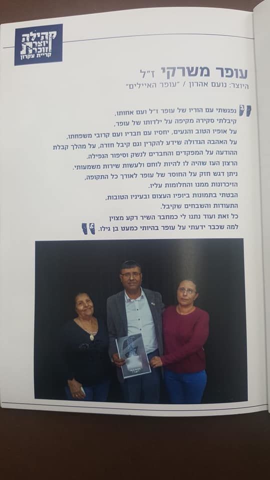 כמו כן נערך אירוע שירי לוחמים בו ביצע הזמר, רגב הוד, את השיר "עופר האיילים" שנכתב לזכרו של עופר משרקי ז"ל, שנפל במלחמת שלום הגליל, כחלק מפרוייקט שנערך בקריית עקרון "קהילה יוצרת זוכרת קריית עקרון", בו נכתב ספר של אמני היישוב לזכר הנופלים.