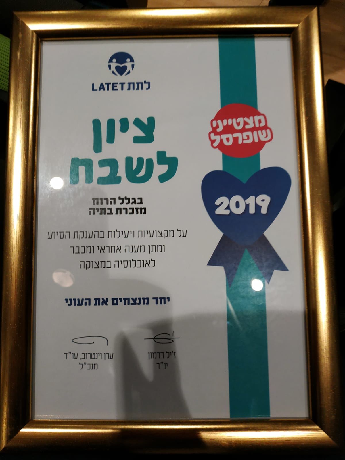 ארגון "לתת" המסייע באיסוף סלי מזון לנזקקים בישראל, העניק בימים אלו תעודת ציון לשבח לעמותת בגלל הרוח במזכרת בתיה. התעודה נתנה לארגון על תרומתם הרבה לנזקקים במהלך שנת 2019 בה נאספו סלי מזון בשווי של כ 400,000 ש"ח מסניפי שופרסל במזכרת בתיה ובצומת ביל"ו.