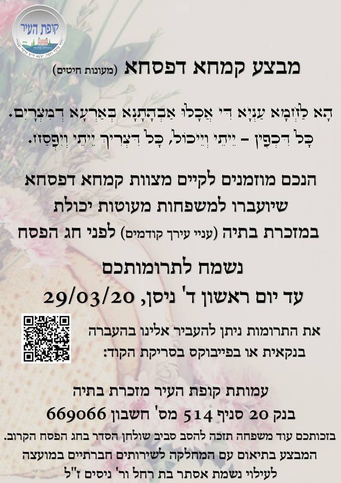 מבצע קמחא ופסחא של קופת העיר מזכרת בתיה יוצא לדרך למשפחות נזקקות ביישוב; את התרומות ניתן לבצע דרך העברה בנקאית או בפייבוקס