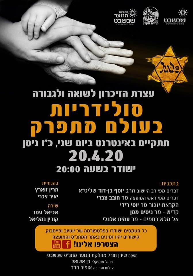 יום שני 20.4.20 בשעה 20:00 יתקיים טקס יום השואה בהפקת מחלקת הנוער של היישוב