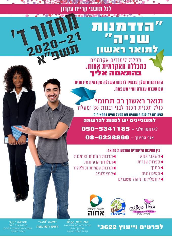 מועצת קריית עקרון פותחת את ההרשמה למחזור ד של תוכנית "הזדמנות שנייה לתואר ראשון לתושבי בגילאי 30+ במכללת אחווה; לפרטים: אגף החינוך – 08-6228860