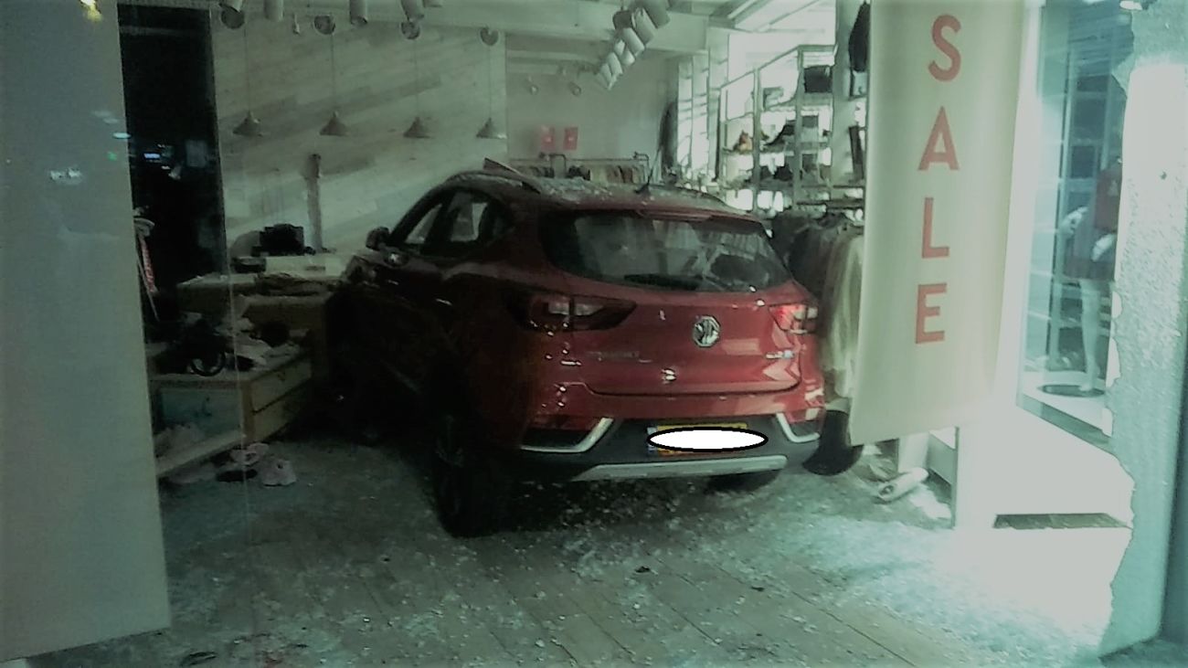 יום שני 4/1 שעה 20:05 נהגת רכב כנראה לחצה בטעות על דוושת הגז נכנסה עם הרכב לתוך חנות אופנה במתחם בילו סנטר.