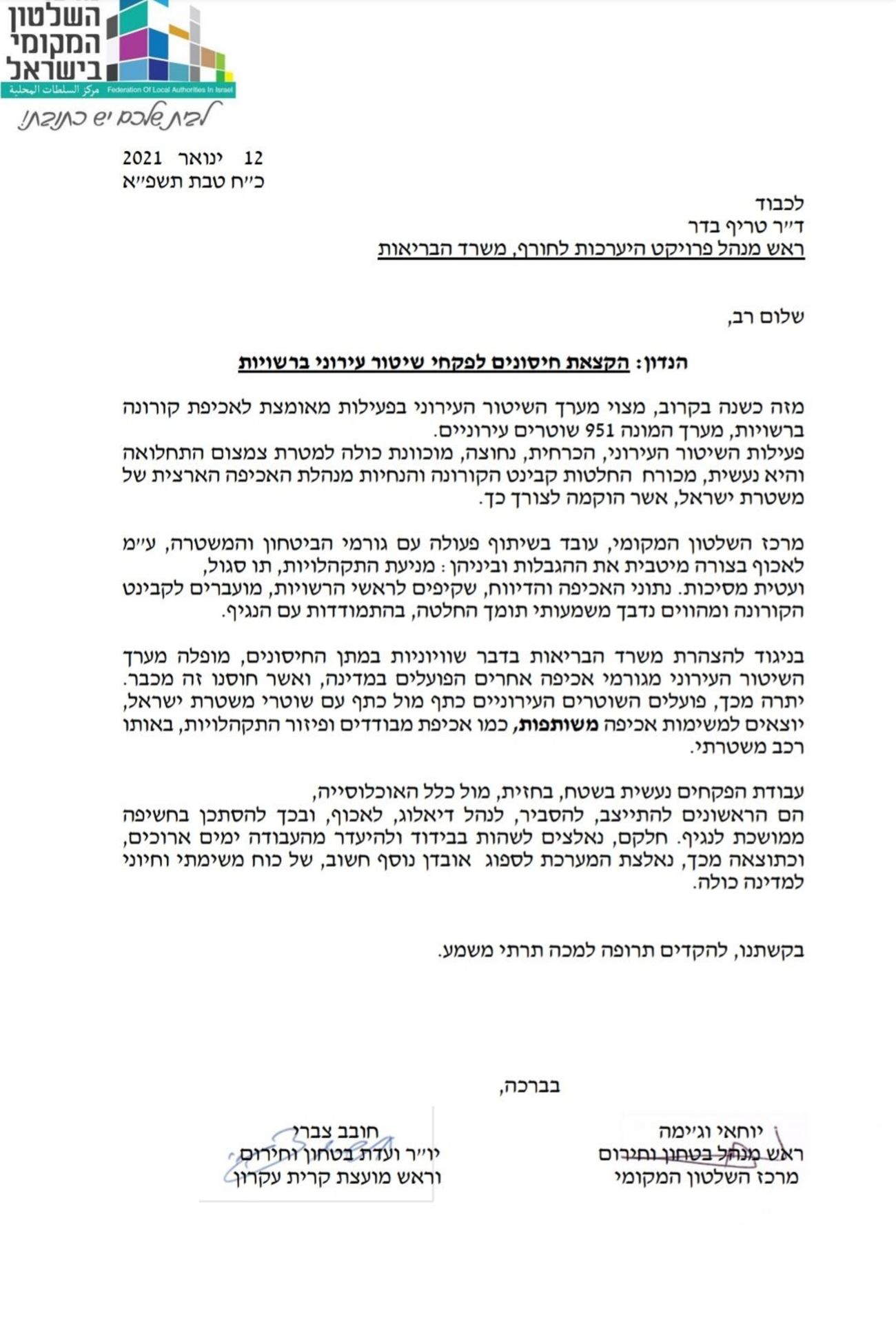 במכתב שנשלח למשרד הבריאות הוא מבקר את האפליה שסובל ממנה השיטור העירוני, ומבקשים לחסן את 950 השוטרים העירוניים שלא חוסנו עדיין וזאת בניגוד להחלטת משרד הבריאות, לחסן את כל גורמי האכיפה, אשר חוסנו זה מכבר.