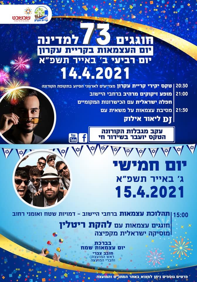 קריית עקרון חוגגת 73 למדינה! מופעי זיקוקים, טקס יקירי עקרון, מסיבת עצמאות ברחבי היישוב עם J.D ליאור אילוק, תהלוכת עצמאות מחכים לתושבים בחגיגות יום העצמאות ברחבי היישוב