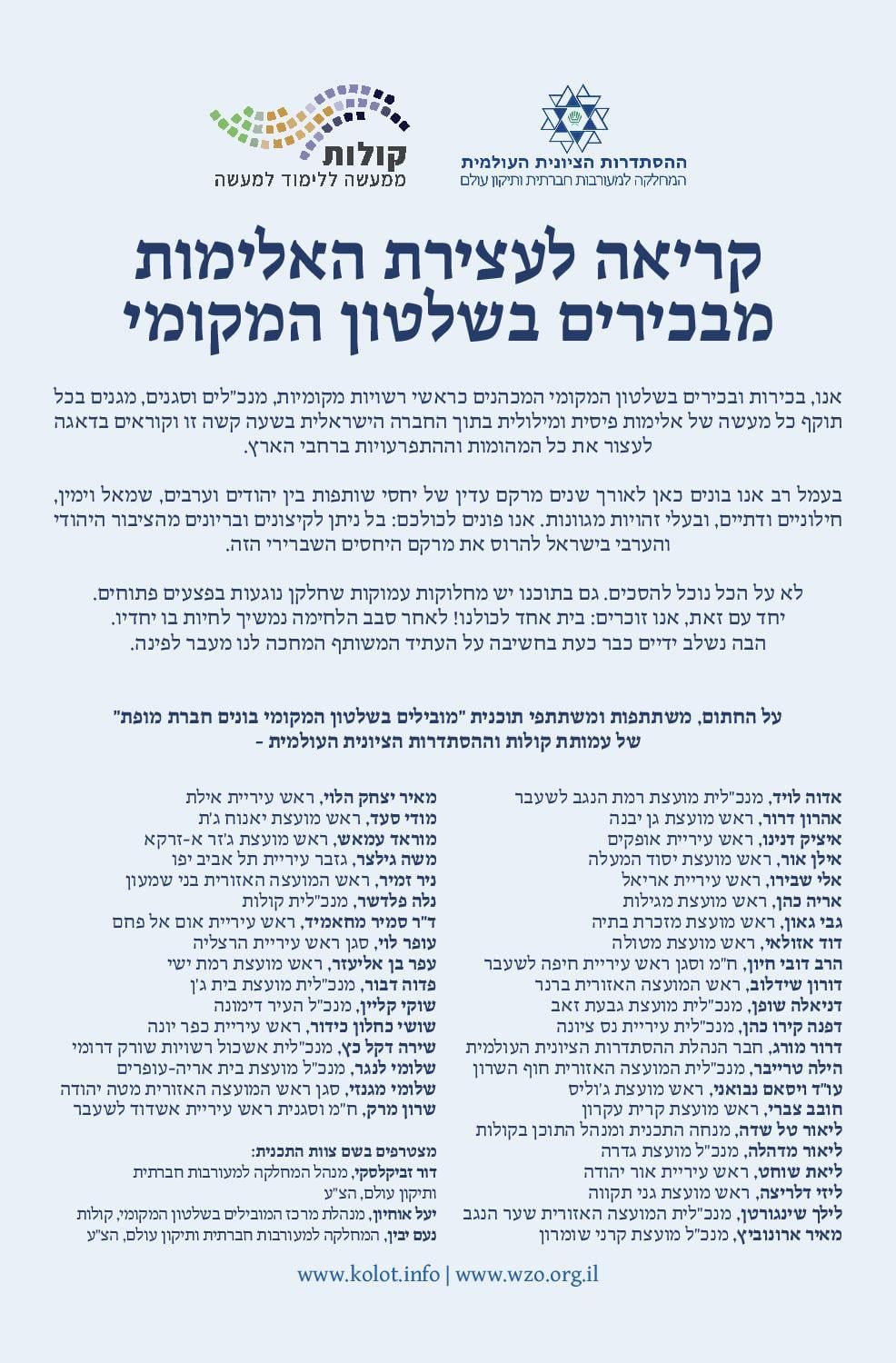 ראשי הרשויות חתמו על מכתב של ההסתדרות הציונית ותוכנית קולות הקוראים לכל הצדדים לשלב יחד ידיים להפסקת האלימות בחברה הישראלית