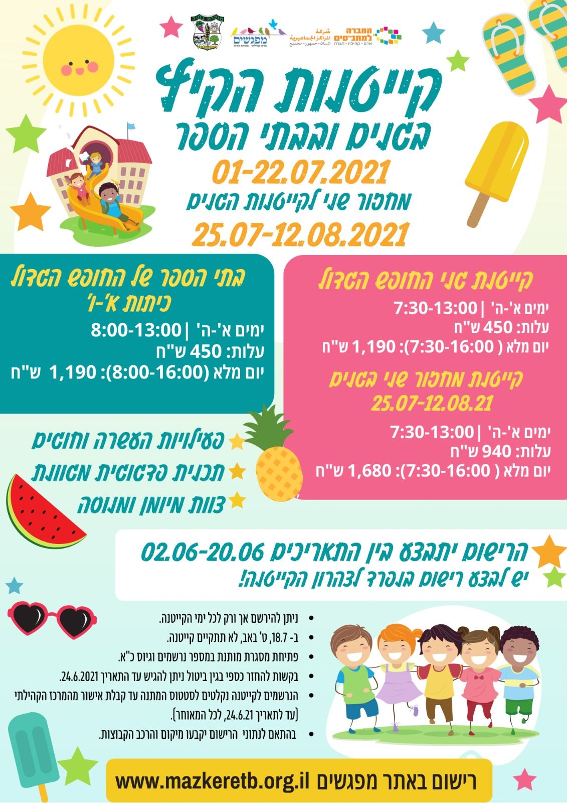 קייטנת מחזור שני תתקיים בין ה-25.07-12.08.21, עם אפשרות ליום קצר או רישום לצהרון.