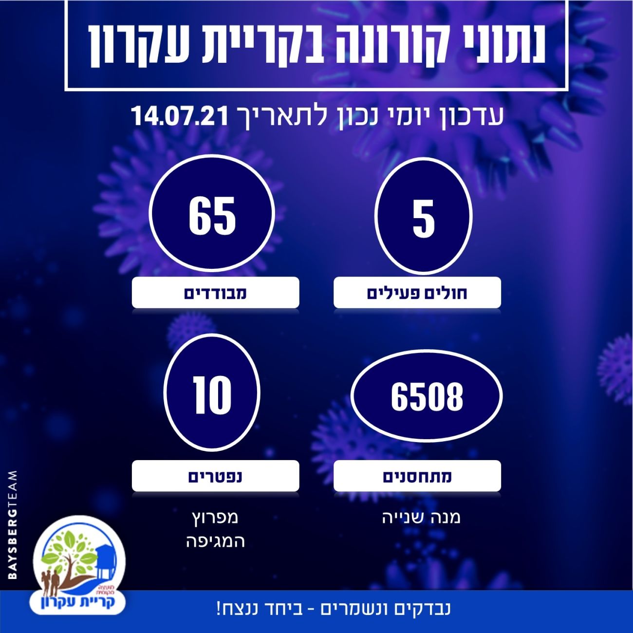 תחלואת הקורונה בקריית עקרון ליום רביעי 14.7.21