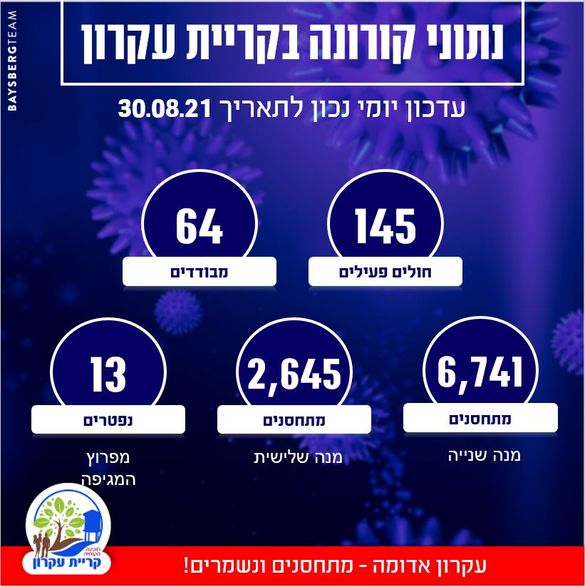 נתוני התחלואה בקריית עקרון ליום שני 30.8.21