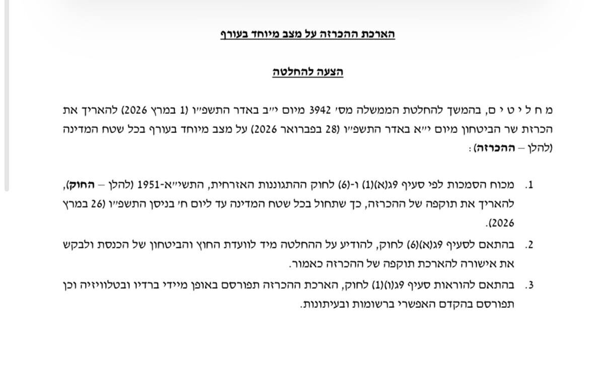 הממשלה עומדת להכריז כי מצב החירום במדינה יהיה לפחות עד 26/3/26.