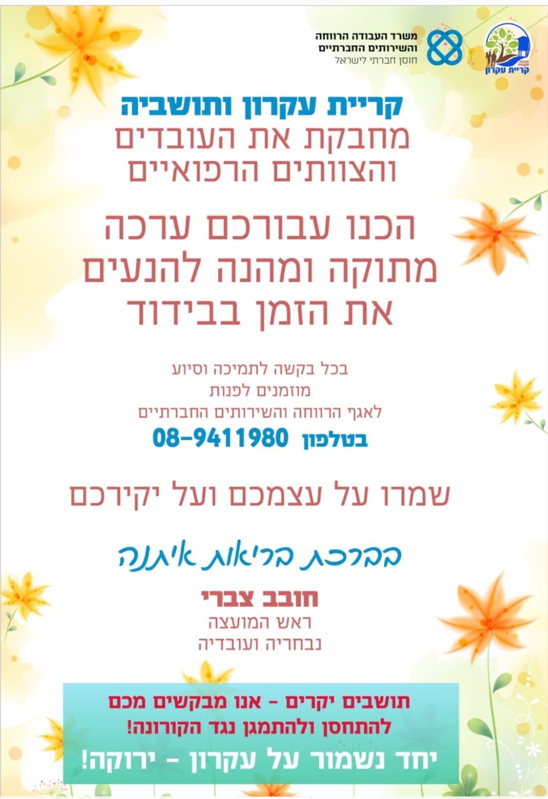 המועצה מקומית קריית מחבקת ומחזקת את הצוותים הרפואיים תושבי קריית עקרון הנמצאים בבידוד. בימים אלו שהתחלואה עולה והגיעה גם לצוותים הרפואיים, החליטו באגף לשירותים חברתיים להוקיר את עבודתם ודאגו לשי קטן ומתוק לצוותים המבודדים שנשלח לבתיהם יחד עם ברכה.