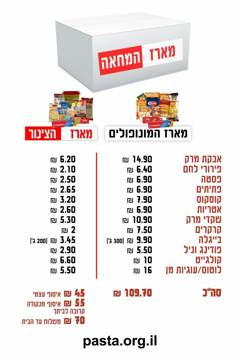 מדובר על מארז המכיל פסטה, פתיתים, קוסקוס, פירורי לחם, אטריות סבתא, משחת שיניים, שקדי מרק, אבקת מרק, פודינג וניל, קרקרים, בייגלה ועוגיות שעלותו 45 ש"ח לעומת 109 ש"ח של מוצרי החברות הגדולות.