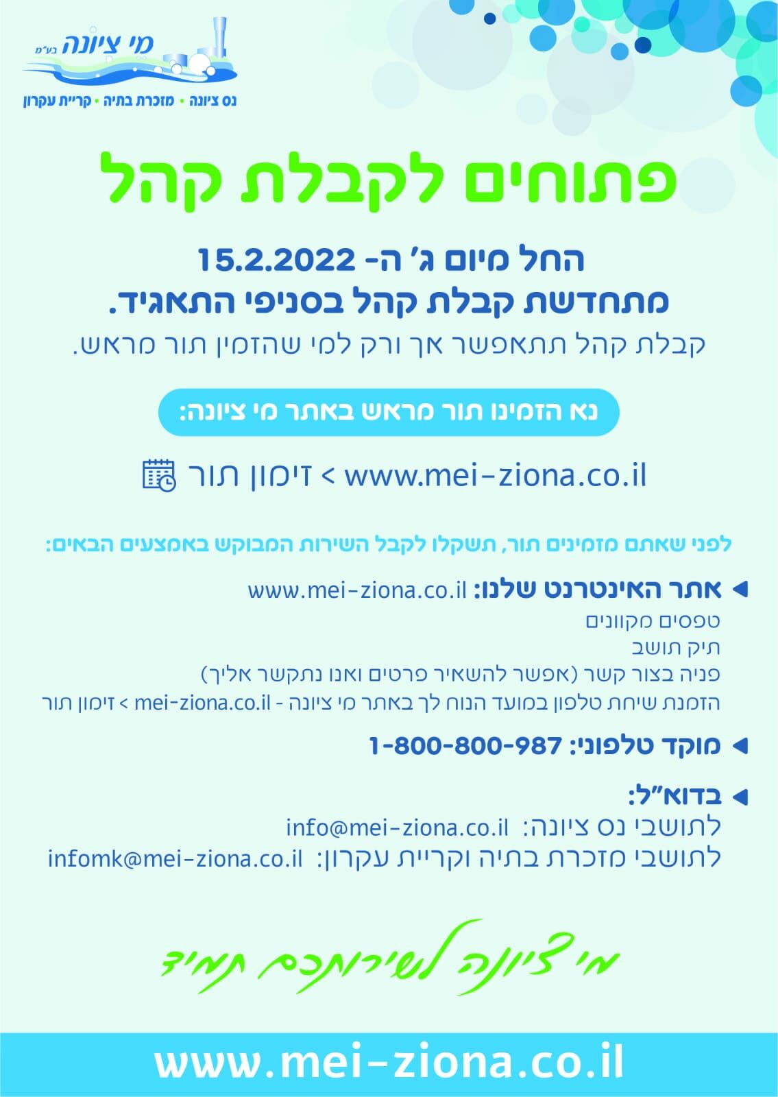 בנוסף תשוב קבלת הקהל בתאגיד המים, מי ציונה, בהזמת תור מראש באמצעות אתר האינטרנט https://www.mei-ziona.co.il/