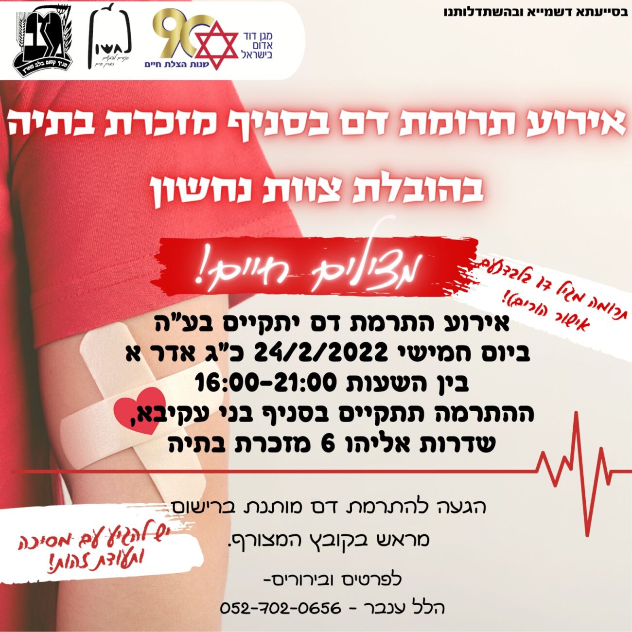 לאור המחסור החמור במנות דם יתקיים היום, 24.2, כ״ג באדר א, מבצע התרמת דם בסניף בני עקיבא במזכרת בתיה.